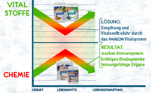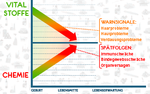 Normally at birth the amount of poisonous substances is low and the amount of vital substances is very high in the body. We observe following during our life span due to poor nutrition contaminated with dangerous chemistry:
